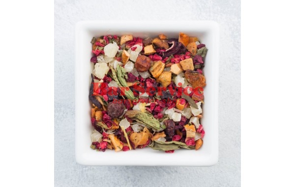 Витаминный напиток на основе плодов шиповника с кусочками сладкого яблока, свеклы, моркови и ягодами спелой малины, гибискуса, мяты, чабреца, стевии, ромашки, лепестков розы и календулы, ананаса.